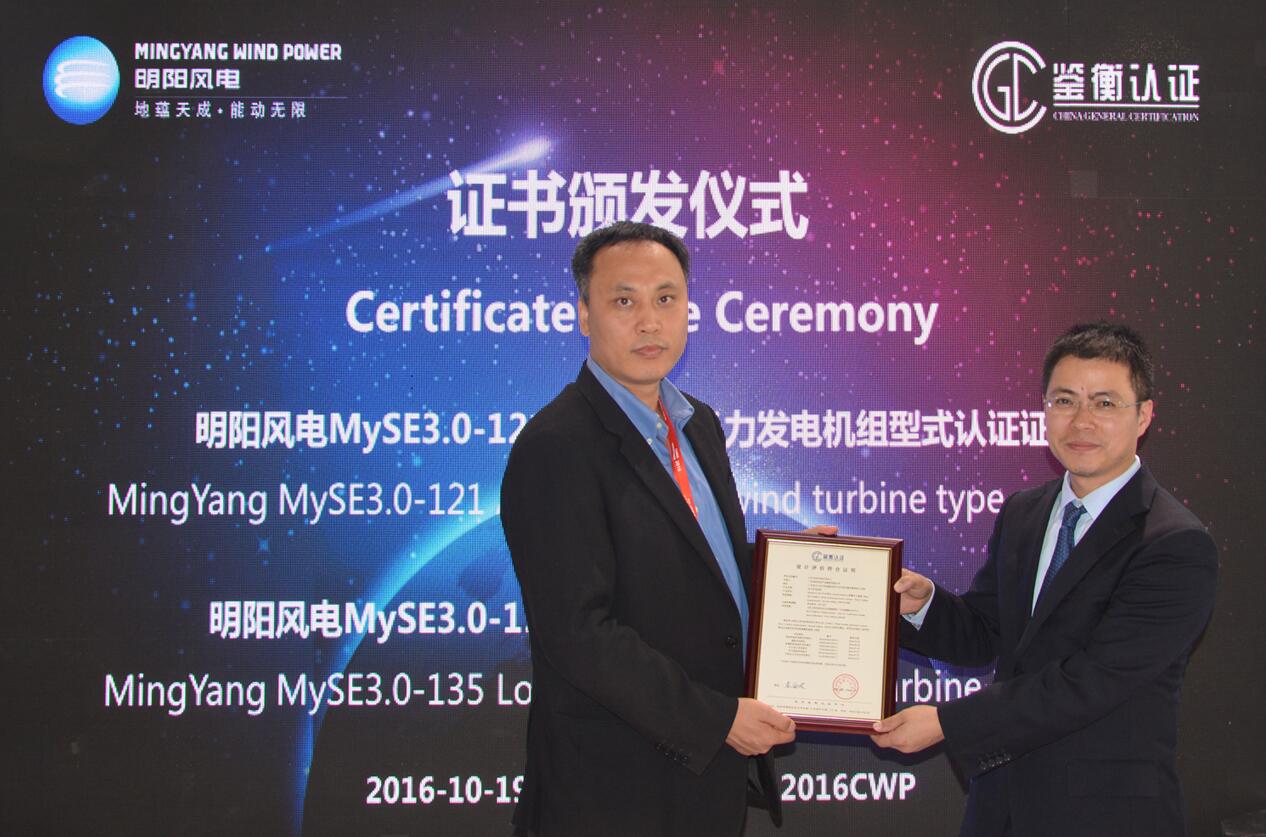 展会首日,MySE3.0-121抗台风型风力发电机组和MySE3.0-135低风速型风力发电机组分别荣获由北京鉴衡认证中心颁发的型式认证证书和设计评估证书,这意味着MySE系列产品满足各项标准化要求并得到行业的认可。