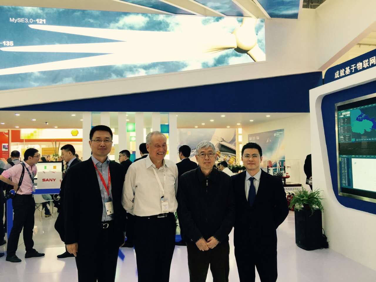 世界风能协会主席、中国风能协会理事长贺德馨(右二),中国风能协会名誉理事长施鹏飞(左二)与皇家国际风电集团总裁王利民(左一),皇家国际风电首席技术官张启应(右一)亲切合影
